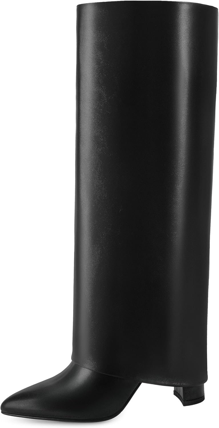 Knee High Boots Women Fold Over Knee High Boots Chunky High Heels Long Boots Zipper Pointed Toe Dress Tall Boots for Women