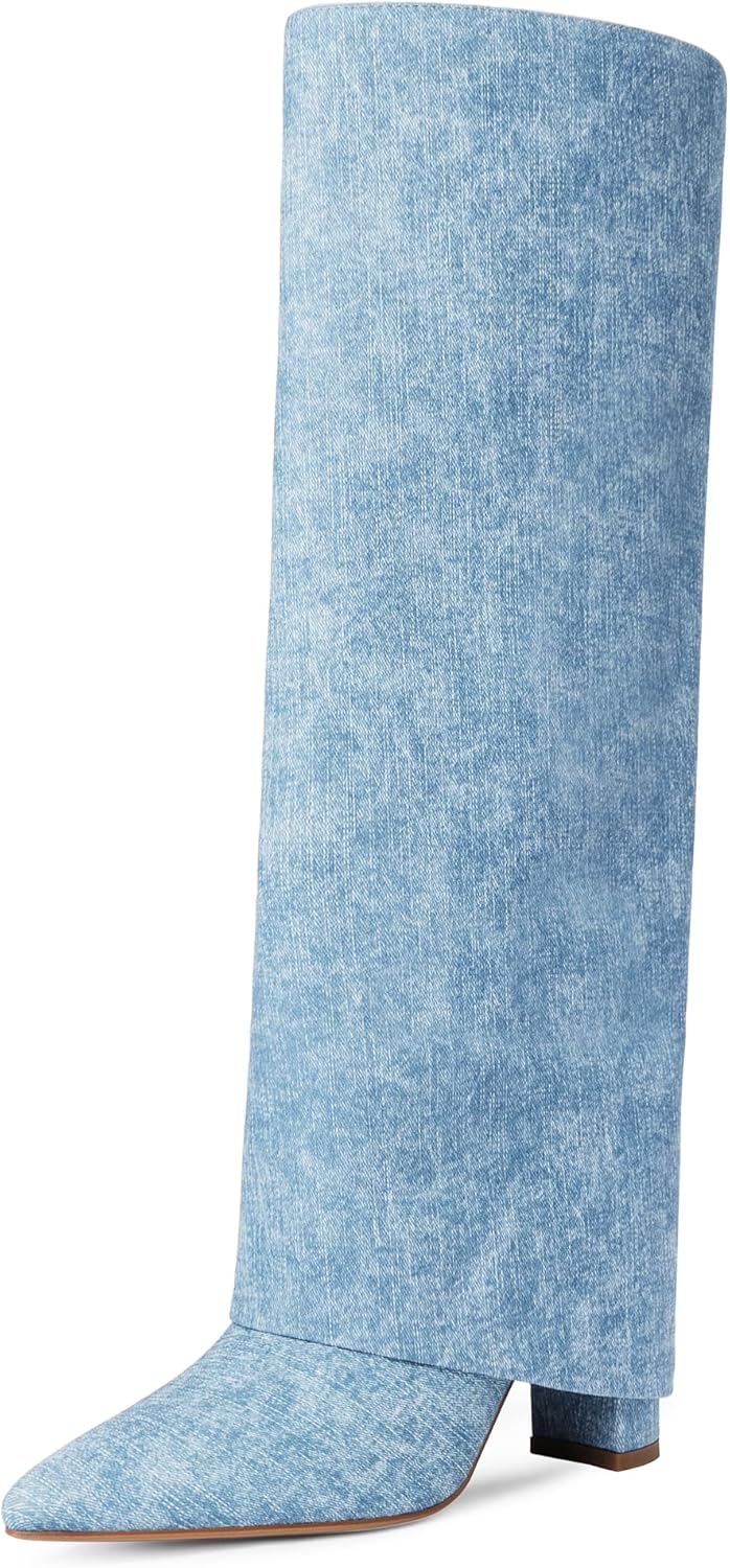 Knee High Boots Women Fold Over Knee High Boots Chunky High Heels Long Boots Zipper Pointed Toe Dress Tall Boots for Women